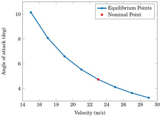 The Ultrastick 120 LPV model is then generated by obtaining a set of equilibrium points holding a constant pitch/yaw angle and varying airspeed between 15 and 29 m/s. These equilibrium points are shown in Figure 7, where airspeed m/s is chosen as the nominal flight condition. Robust nonlinear and linear controllers for such UAVs are designed, with performance analysis presented below.