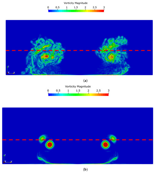 (a) Highly turbulent case. = 600 m/s, t = 132 s, h = 54.5 m (b) The interaction with the secondary vortices during take-off/landing. = 300 m/s, t = 60 s, h = 37 m.