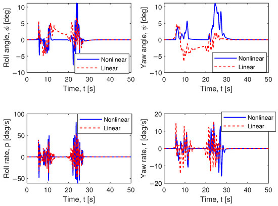 Figure 9 and Figure 10 demonstrate the response of the aircraft to the disturbance created by the highly turbulent velocity fields at m from the ground surface and expressed in terms of roll rate disturbance and horizontal velocity disturbance. Roll rate p and yaw rate reactions are similar for both controllers in terms of amplitude and convergence rate. The horizontal velocity v oscillations tend to be bigger for the nonlinear controller. The rudder and ailerons’ deflections (Figure 11) are also bigger in the case of the nonlinear controller. In general, the highly turbulent case is characterized by sharp peaks in each state, which correspond to intense oscillations in the velocity field and the resulting forces and moments acting on the aircraft.
