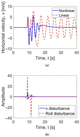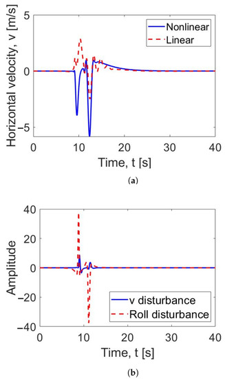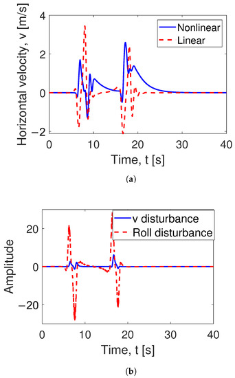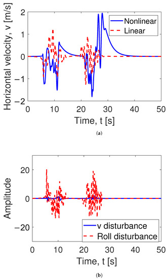 Take-off/Landing case. (a) Horizontal velocity and (b) Disturbance. Nonlinear controller vs. linear controller.