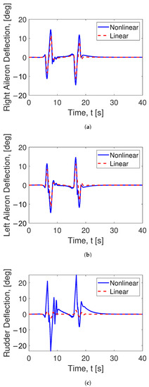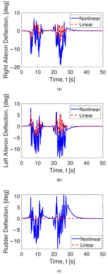 Take-off/landing case. Deflection surfaces’ deviations for (a) left aileron, (b) right aileron, and (c) rudder. Nonlinear controller vs. linear controller.