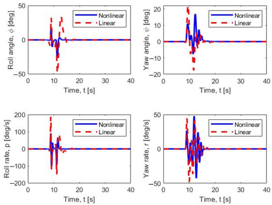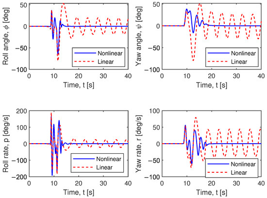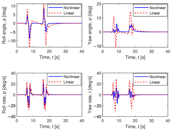 The take-off/landing case is shown in Figure 8b and is characterized by fully formed secondary vortices revolving over the primary ones. This case is different from a highly turbulent one by vortex strength. The trajectory of the follower airplane crosses both of them at H = 37 m from the ground. In this case, the nonlinear controller outperforms the linear one: the maximum amplitude of the states’ deviation is lower, and the convergence time is shorter (Figure 12 and Figure 13a). However, this advantage is reached at the expense of energy spent on surface deflection (Figure 14). The wake vortex is characterized by:
