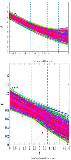 Furthermore, Monte-Carlo simulations for the steady-level flight regime are performed for the OGE zone. Based on the data from NASA-conducted airport experimental measurements, the real cone of uncertainty of the wake vortex pair evolution (position and strength) was modeled using the WVSS. Thus, the controller performance was investigated within the experiment-based cone of uncertainty. The controller ability to withstand the wake vortex induced disturbances within the terminal zone was demonstrated. The full procedure of the Monte-Carlo approach and validation with the experimental data is discussed in our previous work [31]. Hence, the steady-level flight phase is modeled in the out-of-ground zone.