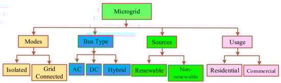 PV-integrated microgrids are directly connected to EV charging stations using renewable energy without ESU through an EV-PV converter [,,]. Generally, the PV power generation is variable in nature and its regulation is made through a grid connection. It also has various advantages, such as high quality uninterrupted power supply to the load, automatically isolated from the utility grid during fault conditions, and provides power to the utility grid when deficient [,]. Different classifications of microgrids used for EV charging are shown in Figure 3.