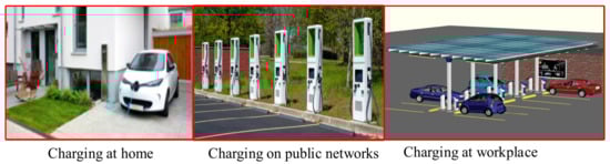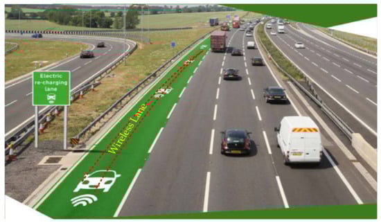 Charging at workplaces through an installed PV in the building’s rooftop and parking lot reduces land and initial cost investment []. According to a national household survey, 90% of vehicles are parked for 5 to 6 hours in a parking lot, so workplace charging supports the vehicle in grid (V2G) charging []. The charging stations in different places are shown in Figure 4. Regardless of the power source, automobile makers are required to achieve extremely high reliability standards. Furthermore, the enormous energy capacity and potentially volatile nature of some battery technologies pose a serious safety hazard. Reliability, availability, and maintainability are main concerns in charging stations, restricting large-scale commercial utilization of these vehicles. The EV is reliant on grid power and the charging system’s dependability []. Thus, a grid-connected charging station reliability model was created. It sought to investigate the reliability, availability, and maintainability issues faced by EV charging stations; study how fault events are logically related to one another, how a PEV’s reliability is influenced by these fault events, and how proper management strategies can improve a vehicle’s availability []; and to look into the impact of a charging station on PEV availability. A modified probabilistic index was also proposed to evaluate the power supply’s reliability. An IC was designed to be controlled by an external BMS control unit via a serial peripheral interface (SPI), which also allowed for the retrieval of acquired data []. EV batteries are charged through conductive coupling, wireless charging, or replaced using battery swapping technique. Wireless charging in the U.K. to test roads that charge electric cars as they drive is shown in Figure 5 [,].