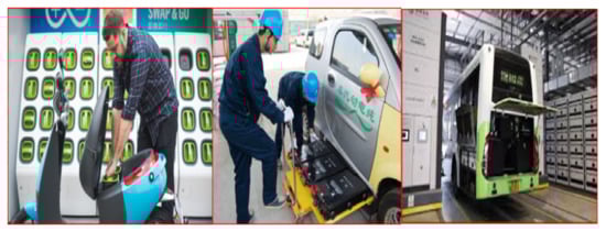 Wireless charging of an EV is done by either inductive or capacitive coupling. In the conductive coupling type, an electrical outlet plug is used to charge the EVs []. Here, two separate coils are used for power transfer—one coil is placed inside the vehicle and acts as the receiving coil, while the other one is placed on the parking slot to transfer the power. In capacitive charging, four capacitive plates are used for charging []. The cost of the charging can be reduced by developing a level-based charging station. The time taken for charging is reduced through battery swapping technology [,,]. The pros and cons of the types of charging are presented in Table 1. The different battery swapping stations are shown in Figure 6 []. EV chargers are classified into two types: off-board charger and on-board charger. The charger located inside the EV is called an on-board charger and the charger located outside the EV is called an off-board charger [,]. A block diagram of the types of chargers is given in Figure 7.