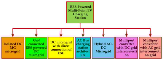 A microgrid-based charging station architecture combines energy sources and ESU localization of distributed loads, offering the capability of operating in a connected grid or in islanding mode. A charging station with renewable energy sources provides an option for charging of the EV without any power conversion losses []. There are different types of RES connected to the DC bus, like PV, wind, super capacitor, and fuel cell []. Some of the problems in microgrids include steady-state and transient voltage and frequency control []. The different types of charging station architectures are shown in Figure 8. In addition, there are problems associated with protection and short circuit, and power quality during islanding and fault conditions of the system []. The photovoltaic system is the main source of renewable energy in an RES-powered DC bus system, with a different arrangement to supply power to the local load and EV. This section discusses the different architecture of microgrids used for EV charging. Based on RES and a load connection charging station, a different topology is framed, one that requires a different energy management control strategy [,].