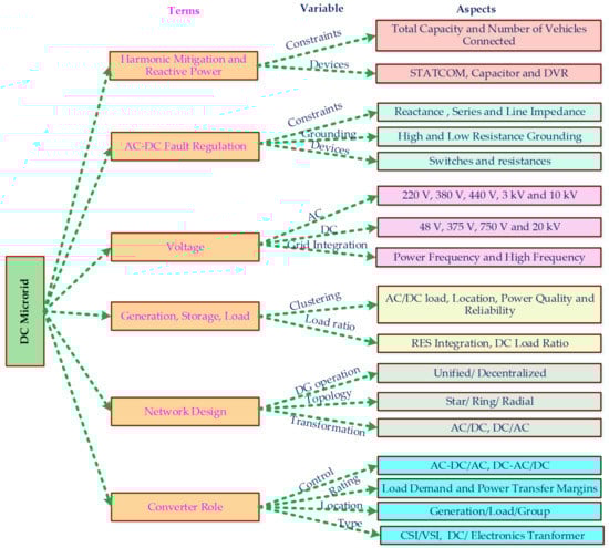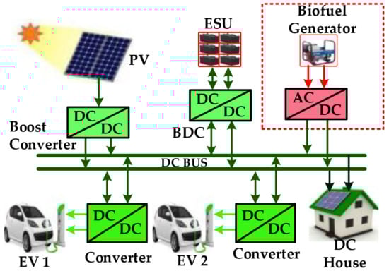An isolated DC microgrid is powered by renewable/non-renewable energy sources such as PV or biofuel generators through dedicated converters. In isolated microgrids, a common DC bus is used for efficient integration storage and renewable energy sources []. Diesel generators are frequently used to generate electricity, posing environmental and logistical challenges. Diesel power plants emit a lot of greenhouse gases. Furthermore, diesel must be transported to remote locations, posing concerns, such as leaks on islands. Renewable energy sources (RESs) have thus been implemented in many parts of the world to address such challenges. The generation of renewable energy sources, however, has a lot of changes and uncertainties, which might lead to problems in stability []. DC microgrid integration with energy sources is not required for frequency and phase synchronization, like the AC grid system. Therefore, a DC microgrid system can be used when a DC load is connected to the grid. The only problem is that the DC bus voltage needs to be stabilized. This type of microgrid architecture can supply load power based on the power available at the generation side []. In an isolated DC microgrid system, it is easy to optimize power flows at the DC bus with minimum cost of power control signal and transmission; a structure of this microgrid is shown in Figure 9 []. The isolated microgrid-based charging suggests that investing in new PV generation and implementing EV charging techniques for a new fleet will result in a lower microgrid net present cost, particularly if EV penetration is high.