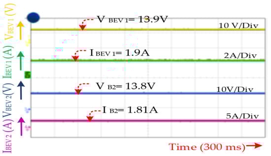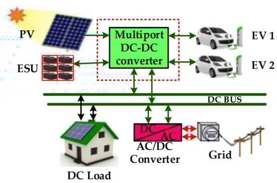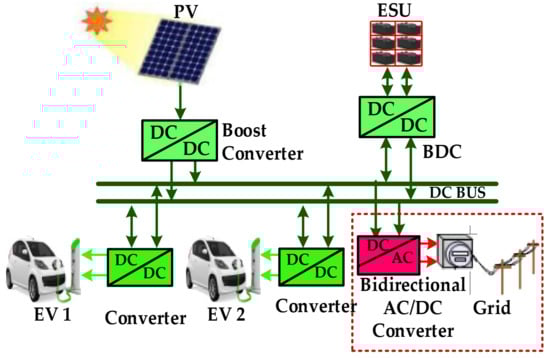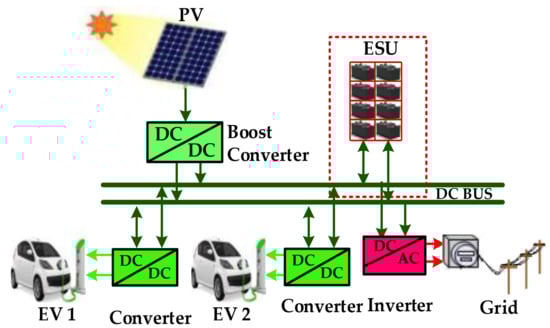 The grid-connected topology shares a common DC bus between all the sources and load; it also allows the PV and the battery storage to work in parallel []. The EVs charged from the PV or ESU mostly depend on RES; the decision depends on power management []. The PV is connected to the DC bus using MPPT and ESU is connected using a bidirectional converter. The main drawback of this architecture is DC-to-AC conversion for grid integration. Another characteristic is the ability of the energy storage to feed the grid or load of the households. This architecture can operate in various modes based on the power available at the charging station []. This architecture can be used for charging electric vehicle batteries using DC supply, as shown in Figure 10.