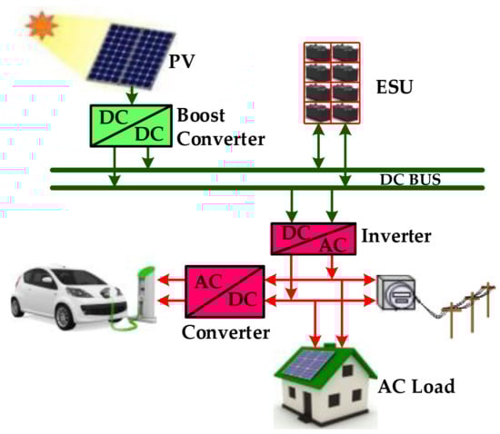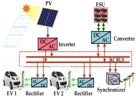 In AC-coupled microgrid architecture, all the loads are connected to the common AC bus, as shown in Figure 12. In this, the ESU is connected to the AC bus through the AC-to-DC bidirectional converter []. This type of architecture gives an option for sizing of all the parts independently. The connection to the grid and local load might provide more flexibility to the system in terms of charge and discharge of the battery and peak time management []. The AC bus-coupled architecture is preferred for home-based charging due to its well-defined standards. In addition, AC technology and its products are already available in the market []. However, considering renewable energy sources, solar integration DC bus-based systems are more efficient due to fewer amounts of conversion loss. The AC grid-based charging station requires power compensation to measure active power at the point of common coupling [].