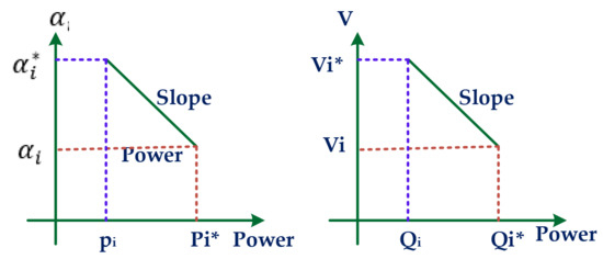 where is the reference rated voltage of the DC bus, is the reference rated microgrid operating frequency. , are the rated value of real and reactive power and , are the measured real and reactive powers, respectively. Here, m and n are the droop coefficients derived for the maximum ratings of the load.