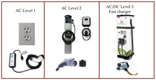 Electric vehicles are becoming popular due to their less emissions and lower fossil-fuel dependency []. The renewable energy sources used in distribution networks, in connection with charging station electrification of smart grids, provide a choice for high power conversion efficiency and emission reduction []. The microgrid consists of a group of distributed energy sources and energy storage units utilized locally by different types of loads and operated in a grid-connected or islanding mode []. A typical EV charging station, as part of a microgrid infrastructure, is shown in Figure 1. However, large capacity penetration of EV charging points increases the demand in charging infrastructure; this impact raises the demand on the utility grid []. To mitigate the problems related to power demand, powers generated locally from the RES are integrated with suitable power converter topologies []. Charging station facilities are provided by EV manufacturers as a part of their charging infrastructure; for example, Tesla created solar city and Nissan Leaf created sun power []. However, charging stations developed using renewable energy integration further reduce the cost of charging and emission, and increase the coordination of the utility grid [,].