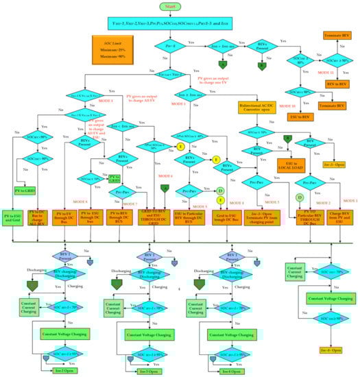 Control of the entire system requires the bidirectional control system for both AC and DC bus []. A three-layer coordinated control algorithm was developed to control the hybrid AC-DC micro grid to coordinate the sources without overlapping each other []. Different layers perform distinct operations; the first maintains DC grid voltage and provides coordinated supply to all DC charging points. The second layer controls the AC bus RMS voltage regulation and maintains the frequency from the three-phase AC grid. The third layer operates between AC and DC microgrids through an interlinking converter. Its control facilitates different power flow operations, such as from vehicle to grid and PV to ESU. The control actions of the charging point are done through a localized controller, but the overall control of the charging station is managed through the main controller [,].