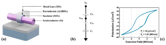 (a) Bird’s-eye view and (b) equivalent capacitive model of MFIS-structured NF-JL-NWFETs. (c) Experimentally measured polarization versus coercive field of 10 nm-thick Al:HfO2 (HAO) capacitor.