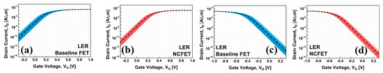 Simulated IDS-VGS curves (a) for n-type JL-NWFET (JL) and (b) for n-type NC-JL-NWFET (NC-JL) with LER. IDS-VGS curves (c) for p-type JL-NWFET (JL) and for (d) p-type NC-JL-NWFET (NC-JL) with LER. The dotted line indicates the nominal IDS-VGS for JL-NWFET and NC-JL-NWFET.