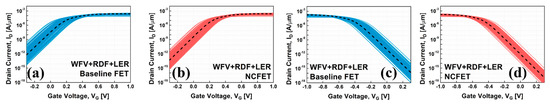 Simulated IDS-VGS curves (a) for n-type JL-NWFET (JL) and for (b) n-type NC-JL-NWFET (NC-JL) with three random variations (WFV, RDF, and LER). IDS-VGS curves (c) for p-type JL-NWFET (JL) and for (d) p-type NC-JL-NWFET (NC-JL) with (WFV, RDF, and LER). The dotted line indicates the nominal IDS-VGS for JL-NWFET and NC-JL-NWFET.