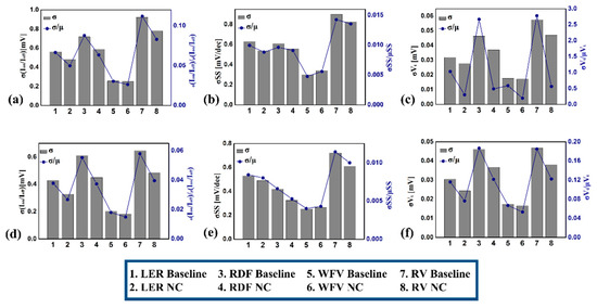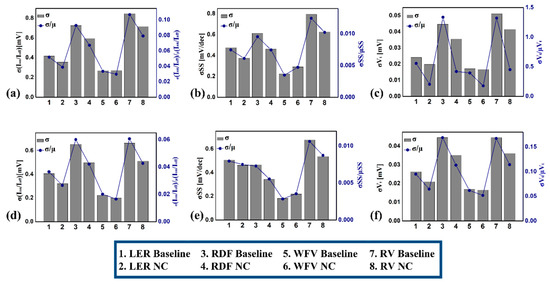 (a) On/off ratio variation [σ(Ion/Ioff)] and [σ(Ion/Ioff)/μ(Ion/Ioff)] comparison, (b) SS variation [σ(SS)] and [σ(SS)/μ(SS)] comparison and (c) Vt variation [σ(Vt)] and [σ(Vt)] comparison between n-type JL-NWFET and n-type NC-JL-NWFET in linear mode. (d) On/off ratio variation [σ(Ion/Ioff)] and [σ(Ion/Ioff)/μ(Ion/Ioff)] comparison, (e) SS variation [σ(SS)] and [σ(SS)/μ(SS)] comparison and (f) Vt variation [σ(Vt)] and [σ(Vt)] comparison between p-type JL-NWFET and p-type NC-JL-NWFET in linear mode.