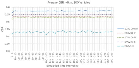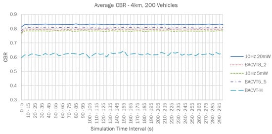 CBR is defined as the ratio between the time the channel is sensed as busy and the total observation time. CBR is an effective indicator of the level of channel load. A higher CBR value typically indicates a higher channel load and vice versa. In order to observe the change of the channel’s CBR throughout the simulation process, each vehicle will calculate the current CBR based on the status of the channel it detects before it sends each BSM. Figure 2 shows the individual CBR values observed by each vehicle over the simulation interval for the 10 Hz 20 mW case. Clearly, it is difficult to observe the overall variations in channel CBR from this plot. So, we use a new metric called “Average CBR”, which calculates the average value of the CBR from all vehicles in 5 s intervals until the end of the simulation time.
