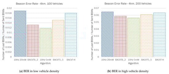 Figure 5 shows the BER values obtained using the different approaches for low density and high density traffic scenarios. All the BACVT algorithms (without rate control) have a lower BER compared to 10 Hz 20 mW, as they will have a lower chance of packet collision. As expected, 10 Hz 5 mW has the lowest BER due to low power transmissions, which means the chance of packet collisions is reduced further. The BER value of BACVT-H is slightly anomalous, since the number of sent BSMs in this case is lower than all the other approaches. So, even though the number of lost packets is smaller compared to most of the other approaches, as shown in Figure 6, the calculated BER value is actually higher.