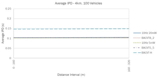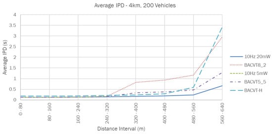 It is interesting to note that for vehicles within 320 m, even with a lower transmission rate, BACVT-H is able to achieve an IPD value that is comparable to (but still slightly exceeding) 10 Hz 20 mW. This is shown in Figure 9 and Figure 10, where BACVT-H has a a slightly higher IPD compared to all the other approaches, which have almost identical performance.