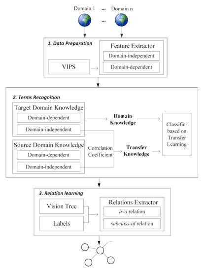 The framework of our domain-independent ontology learning method is illustrated in Figure 1. It mainly consists of three stages, namely, data preparation stage, terms recognition stage, and relation learning stage. (1) During data preparation, VIPS [10] algorithm is used to segment a Web page based on vision. A vision tree which represents the Web page will be built by VIPS. In the vision tree, features from both the micro level and the macro level will be extracted. Features from micro level are about the semantic meaning of text and from macro level are about semi-structured information in the vision tree and DOM tree. Moreover, the domain-independent and domain-dependent features are also extract. (2) In terms recognition, we first obtain the knowledge from the source domain and the target domain, and then calculate the correlation coefficient between domain-independent knowledge. Furthermore, a transfer learning model called TF-Mnt will be built and it will assign a label which is in {concept, instance, none} to each text in the vision tree. See Section 4.2 for detailed information about TF-Mnt model. We will describe what this model is and how it works. Moreover, we also address how to optimize the TF-Mnt model and choose optimized parameters. See Section 4.3 for detailed information about model optimization. See Section 5.1 for detailed information about terms recognition by TF-Mnt model. (3) In the learning of relations, our method will analyze the labeled vision tree to capture is-a and subclass-of relations before constructing the ontology. The basic idea is to search some substructures which reflect is-a relations and subclass-of relations from the labeled vision tree. After terms and relations are all recognized via our method, we will encode them by resource description framework (RDF) for further use. See Section 5.1 for detailed information about the learning of relations.
