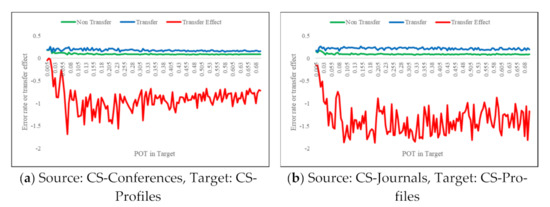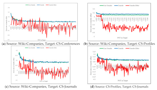 Figure 8e,f show two negative transfer situations. In negative transfer, the error rate increases all the time before approaching to an asymptote which also represents the error rate of the model with only transfer knowledge. Because they are negative transfer, error rates are larger than only transferring with domain knowledge all the time. While no matter in situations of positive transfer or negative transfer, curves will finally approach to an asymptote.