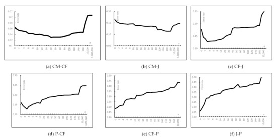 In TF-Mnt, transfer knowledge and domain knowledge are weighted by a and b. This experiment will analyze how these weights affect transfer performance. Here we fix b = 1. Because a and b are linear weights, we can scale them to let b = 1 except the situation that b = 0. For b = 0, it means only use transfer knowledge to construct model and it is equivalence to b = 1 and a. For a = 0, this situation means only use domain knowledge to construct model. Figure 8 shows the result of the experiment, x-axis shows the value of a and y-axis shows the error rate of the corresponding model. It is clear from the figure that these curves have different tendency in positive transfer Figure 8a–d and negative transfer Figure 8e–f.