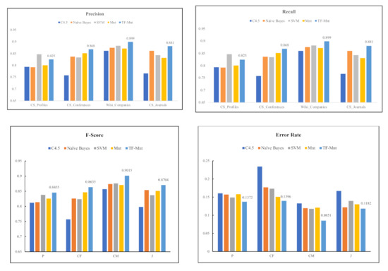 Figure 9 is the result of model comparison. We choose four famous traditional machine learning models, which are decision tree (C4.5), naïve Bayes, support vector machine (SVM) and Mnt. In this experiment, for a specific target domain, the TF-Mnt model will select the source domain with the largest transfer coefficient. Five models were used to compare the precision, recall, F-score and error rate for the four domains. The horizontal coordinates represent each of the four domains. From Figure 9, it can be concluded that the proposed model TF-Mnt has the highest F-score and the lowest error rate in the four domains.