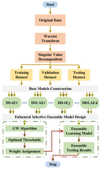 In the first stage, the signal feature is extracted using WSVs. Then, deep base types are built to adaptively learn hidden characteristics from extracted indexes by WSVs of signals to ensure the variety of the base types. In this way: (1) the deep auto-encoders are produced by applying DAE, SAE, and linear decoder; (2) the datasets of distinctive training for every base type are planned by bootstrap. After that, the DWV combination framework with particular class thresholds is planned to conduct an elective ensemble. In the final stage, the GWO algorithm is applied to find optimal thresholds.