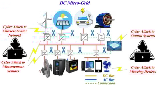 As the importance of communication systems in the cooperative control strategies, DC-MGs are assailable to different kinds of cyber-attack. It has been shown that if a DC-MG operates under undetected cyber-attacks, the DC-MG power control and management scheme can be affected or disrupted. Accordingly, cyber-attack detection has a vital role in reliable and effective operation in a DC-MG [9]. Some new research has focused on several kinds of cyber-attack in electrical power grids. Good examples here can be the denial of service (DoS) and false data injection (FDI) attacks [10,11]. In DoS attacks, the hacker tries to keep the microgrid (MG) communication network fully inaccessible, whereas, in an FDI attack (FDIA), hackers change the status of the system by injecting incorrect data into the sensors [12,13].