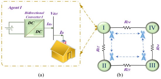 Recent studies have confirmed that with the increasing development of power electronics, DC microgrids (DC-MGs) provide significant efficiency and reliability compared to conventional AC microgrids (AC-MGs), and they are also more cost-effective [1,2,3,4]. In general, to control DC-MGs, the primary control is performed according to the droop technique to adjust the output voltage and divide the current between individual converters locally [5,6]. Ancillary control is executed to restore the voltage of the DC bus. The main goals of cooperative ancillary controllers have been divided into load sharing and voltage adjustment [7,8].
