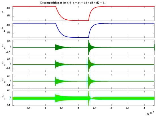 Study Case 3: In this part, the FDIA on the voltage sensor occurs in the 1st unit. System behavior is considered in an example of this type of FDIA, and DL indicators displayed which one has been extracted based on the WSVs. The FDIA starts at t = 0.4 and finishes at t = 0.6 s, respectively. Moreover, the voltage reference signal amplitude changes, and noise adds to the signal. The outcomes of this study case have been displayed in Figure 7. Figure 7a shows that the DC-MG voltage on that the FDIA was reported in a timely manner. Additionally, Figure 7b displays the signal wavelet decomposition in db4, which is used to extract SVs utilized as machine learning input for detecting cyber-attacks.