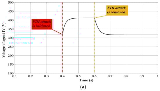 Study Case 2: In this part, the FDIA on the voltage sensor occurs in the 4th agent. System behavior is considered in an example of this type of FDIA, and deep machine learning indicators show which one has been extracted based on the WSVs. The FDIA starts at t = 0.4 and finishes at t = 0.6 s, respectively. Moreover, the voltage reference signals amplitude changes and increases about 30%. The outcomes of this study case have been displayed in Figure 6. Figure 6a shows that the DC-MG voltage on that the FDIA was reported in a timely manner. Additionally, Figure 6b displays the signal wavelet decomposition in db4, which is used to extract SVs utilized as machine learning input for detecting cyber-attacks.