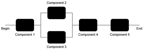 In summary, we have a block model, where the connections between them represent a specific system’s behavior. The connections can express two types of behaviors for the components: serial and parallel connections. Components connected in series means that they all must be working for the system to work. When connected in parallel, at least one of the components must be working for the system to be available [29,30,31].