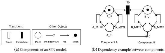 SPNs [32,33,34,35,36,37,38] can be identified as a type of directed graph divided into two parts, filled by three types of objects. These objects are places, transitions, and directed arcs that connect places for transitions and transitions to places. Figure 2a illustrates two types of transitions (timed and immediate). The timed transition follows a stochastic behavior, following a probability distribution function. The immediate transition fires when it is activated, without waiting for any period. The white circle symbolizes places. Arcs are used to connect places to transitions. Inhibitory arcs block or allow the passage of tokens from one place to another. Moreover, the token is assigned to a specific place.