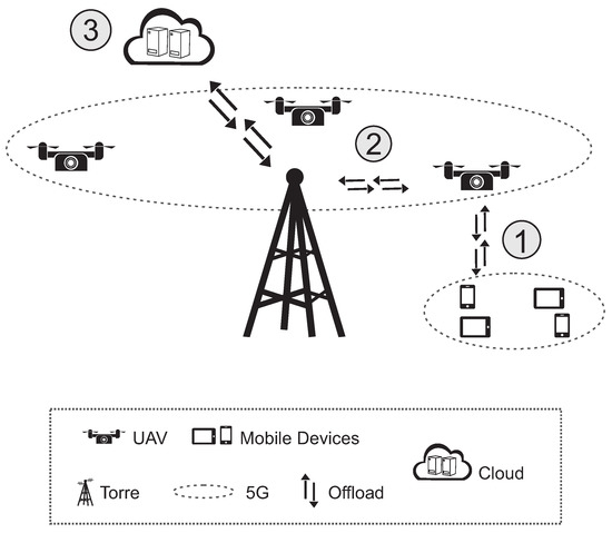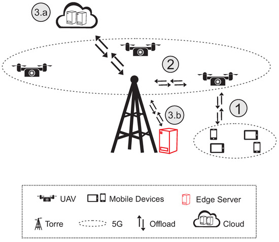 Figure 3 shows the base architecture modeled in this work. The architecture consists of a distributed system composed of IoT devices that generate requests to remote servers. There is a chain of UAVs that communicate with a base station that receives such data. The collected data are processed by a cloud or edge server, depending on the demand. Thus, communication takes place in three stages: