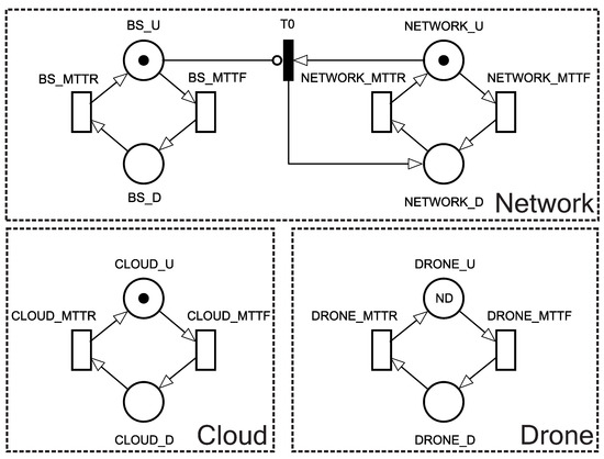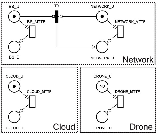 This section presents the SPN base model. The components in the model correspond to the same components shown in the previous section. Figure 5 shows the model with the following functions: (i) UAVs are responsible for collecting data for offloading; (ii) the network is responsible for receiving requests from UAVs and forwarding them to the cloud; and (iii) the cloud is responsible for processing the data. Each component has its respective MTTF and MTTR. The network is modeled, taking into account the dependency between the components. When a component fails, the immediate transition (T0) makes the next component, which depends directly or indirectly on it, also fail.