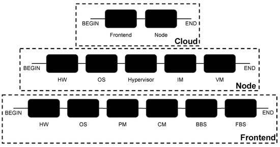 Figure 6 shows the RBD model used to obtain data from the cloud component. We consider a private cloud type. The components adopted are the same platform components as Eucalyptus or OpenStack. The main components that form a cloud are the frontend and nodes. In order to obtain the failure and recovery values of these components, they are subdivided. The node is formed by the following components: hardware (HW), operating system (OS), hypervisor, instance manager (IM), and virtual machine (VM). The frontend is formed by the following components: hardware (HW), operating system (OS), platform manager (PM), cluster manager (CM), block-based storage (BBS), and file-based storage (FBS).