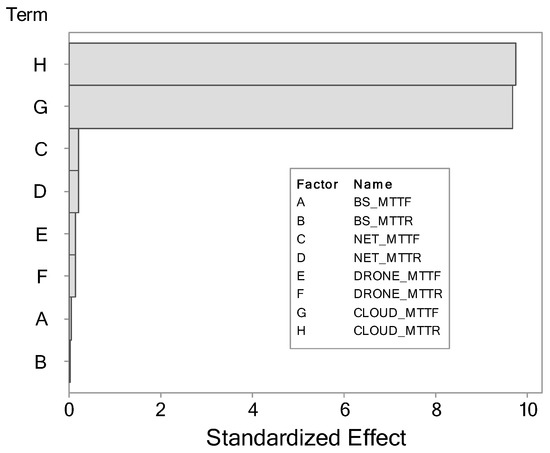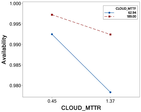 Figure 8 shows the level of interaction between the factors CLOUD_MTTR and CLOUD_MTTF. Such factors were the most significant in the study of the impacts on the Pareto chart. The non-parallel lines indicate that there is an interaction between the factors. The result of changing one factor influences the result of changing the second factor. With a lower CLOUD_MTTF, the variation in CLOUD_MTTR has a more significant influence on availability.