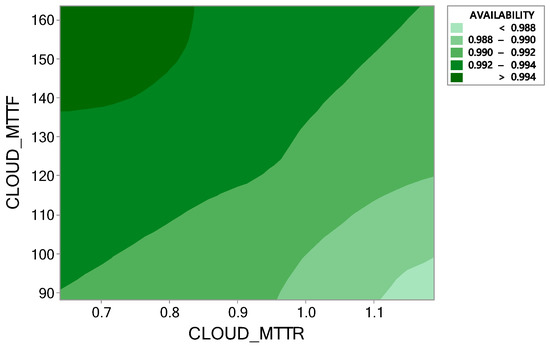 Figure 9 shows a Contour graph of the interaction between MTTF and MTTR from the cloud. The Contour graph shows the same information as the interaction graph, but differently, through heat zones. The higher the MTTF and the lower the MTTR, the greater the overall availability of the system. Assuming that the recovery time is over 1.2, the system never reaches more than 99.2% availability.