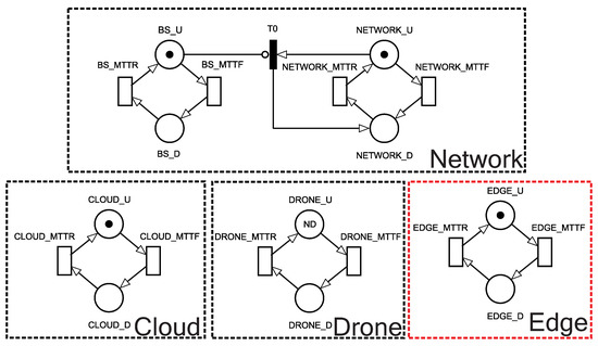 Figure 10 presents an extended SPN model for the UAV architecture, with two processing possibilities (edge and cloud), a network, and a UAV component. To satisfy these conditions, two new transitions are added, EDGE_MTTF and EDGE_MTTR, which represent the failure and recovery time of edge. The places EDGE_U and EDGE_D represent the active and inactive states of edge, respectively.