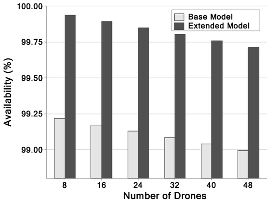 This section presents the availability analysis for the two models already presented. Six scenarios are defined, varying the number of available UAVs (8, 16, 24, 32, 40, and 48 UAVs). These scenarios are defined based on the sensitivity analysis of the models. The UAV is a component that appears in the base model as the second most important and as the most important in the extended model. The metric used in the analysis is that 100% of the UAVs need to be active. These scenarios are generated to compare the two models’ availability and the impact that the number of UAVs generates in each of the architectures.