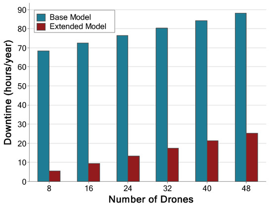 Figure 13 shows the downtime in hours per year. The downtime for the extended model tends to be much shorter than that for the base model. The base model ranges from 68 to 88 h/y. The extended model ranges from 5 to 25 h/y. The extended model’s downtime is kept below the base model, even with six times more UAVs, when comparing the base and extended model’s first and last scenarios. The individual values of the base model grow noticeably more and in a linear manner. After the fifth scenario, the time passes 80 h/y, while the extended model remains below thirty. The difference is significant, but both vary approximately 20 h between start and end. It can be deduced that the difference between each scenario is approximately 63 h of downtime reduction.