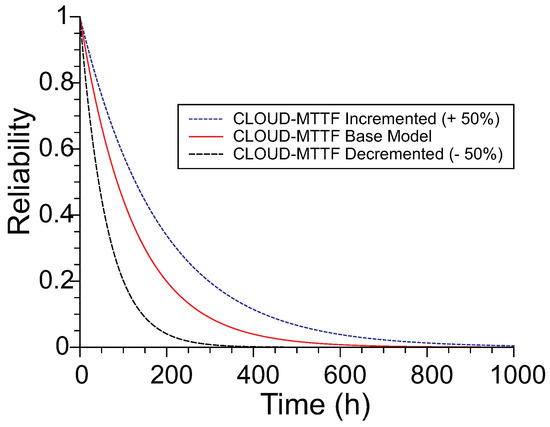 Figure 14 shows the reliability of the system over time. For the reliability analysis, three levels of parameters are proposed: CLOUD_MTTF of the base model, CLOUD_MTTF increased by 50%, and CLOUD_MTTF decreased by −50%. The X-axis represents the time sampling in hours. The Y-axis represents the probability of system failure.