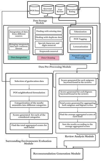 In this section, we will elaborate on the architecture of our hotel recommendation system. Our system contains the following modules: data pre-processing, storage, surrounding environment’s evaluation, review analysis, and recommendation generation. Figure 3 shows our system architecture. In the review analysis module, scores are generated from pre-processed textual reviews. Score generation procedures from the nearby amenities of the hotels are performed in the surrounding environment’s valuation module.