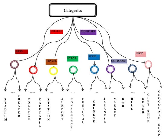 Another dataset is used for the reviews of hotels collected from TripAdvisor (259,000 reviews). This dataset was initially used for opinion-based entity ranking. We collected this dataset from [24]. We considered 875 hotels of London from these large datasets. We created a CSV file where we manually assigned a unique hotel ID for each hotel for our experimental purpose. The CSV file contains five fields which are shown in Table 5. By using Google API, we collected all considered facilities in the nearby area of the hotels. Our system categorizes the nearby amenities of each hotel by using different categories of the category tree shown in Figure 4.