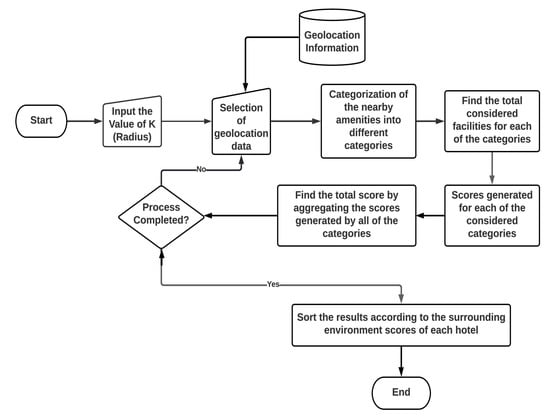 We give +1 score for the most important facilities and 0.5 for the other facilities. After determining the surrounding facilities of a hotel, the scores are generated by using Equations (6) and (7). Each of the considered categories are divided into some or many sub-categories. The overall surrounding environment score of a hotel is determined by aggregating the scores generated from all of the categories for that hotel. The scores are generated for each of the considered sub-category. Let us assume that there is a hotel which has 10 facilities in its surrounding areas within a specific range. Among them five facilities are under the category “Arts and Entertainment” and another five are in the category “Food”. Then, the scores are calculated by adding the results obtained from the surrounding environment scores of all considered categories. There can be two or more sub-categories for each of the categories. For each sub-category, there are two types of weights we consider for the facility. The most important facilities are considered as type-1 facility and other facilities are considered as type-2 facility. For a specific category, scores are generated by adding the surrounding environment scores of all of the sub-categories of the considered category. The surrounding environment score of a specific hotel is calculated by using Equation (7).