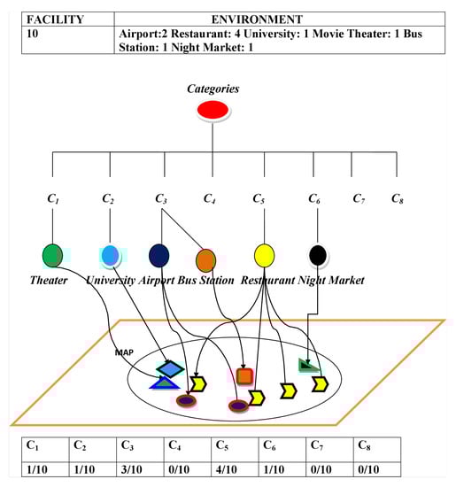 Here, n denotes the total number of sub-categories for a specific category. represents the total number of facilities of type k for sub-category j. In our proposed method, we consider two types of weights, so the value of l is 2.
