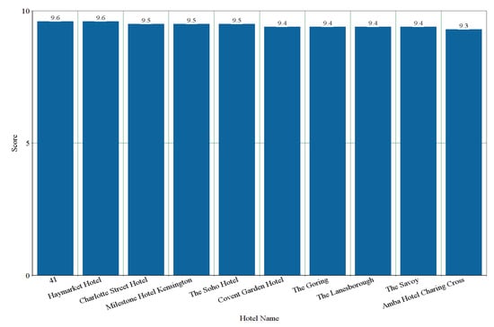By considering nearby amenities of the hotels, the top-10 recommended hotels for the 1493 hotels of booking are shown in Table 10. Finally, the top 10 recommendation generation based on our system is shown in Table 11. By using our developed RSG algorithm, our system generates scores from the reviews. The highest score obtained from the average review scores of each hotel is 6.91. The name of the hotel is “South Place Hotel”. Next, our system analyzed the nearby amenities of the hotels. From Table 10, we can see that “Hotel Kaiserin Elisabeth” is the highest-ranked hotel. Finally, our system computes the aggregated scores of each considered hotel.