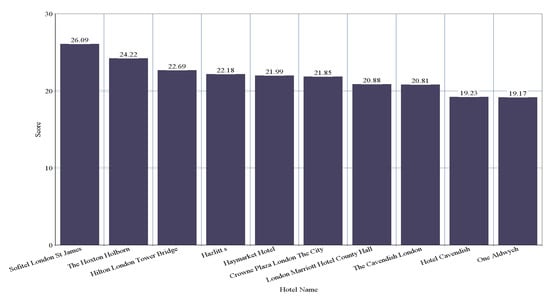 From Table 12, we can also see that “No Ten Manchester Street” is the highest-ranked hotel among 875 considered hotels of London by analyzing the reviews of the hotels. “Hilton London Tower Bridge” is the highest-ranked hotel by both surrounding environments and scores generated by our system. In Table 14, the top-10 recommended hotels by using our system are shown.